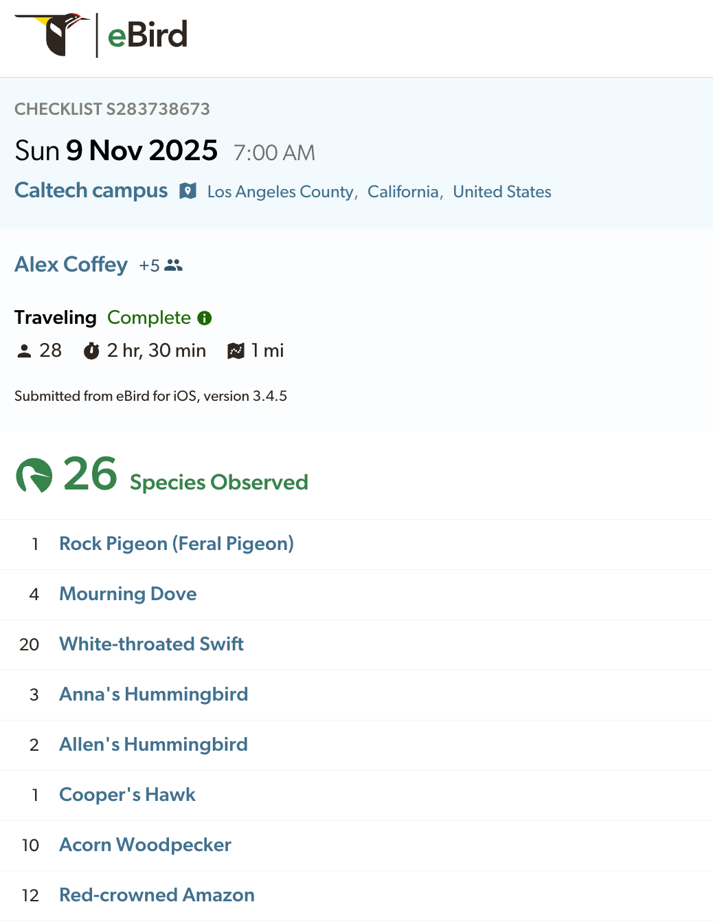 For me, this was the first time leading a large birding group. I felt a bit nervous at the start, but Alex’s experience and everyone’s curiosity and enthusiasm quickly put me at ease. After four and a half years at Caltech, it was deeply satisfying to introduce the campus, with its trees, ponds and feathered residents, to people visiting for the first time. Planning the route also gave me a fresh perspective on familiar grounds. I was delighted to find that we completed the entire loop without using any stairs, a sign that the campus is quite accessible to all.