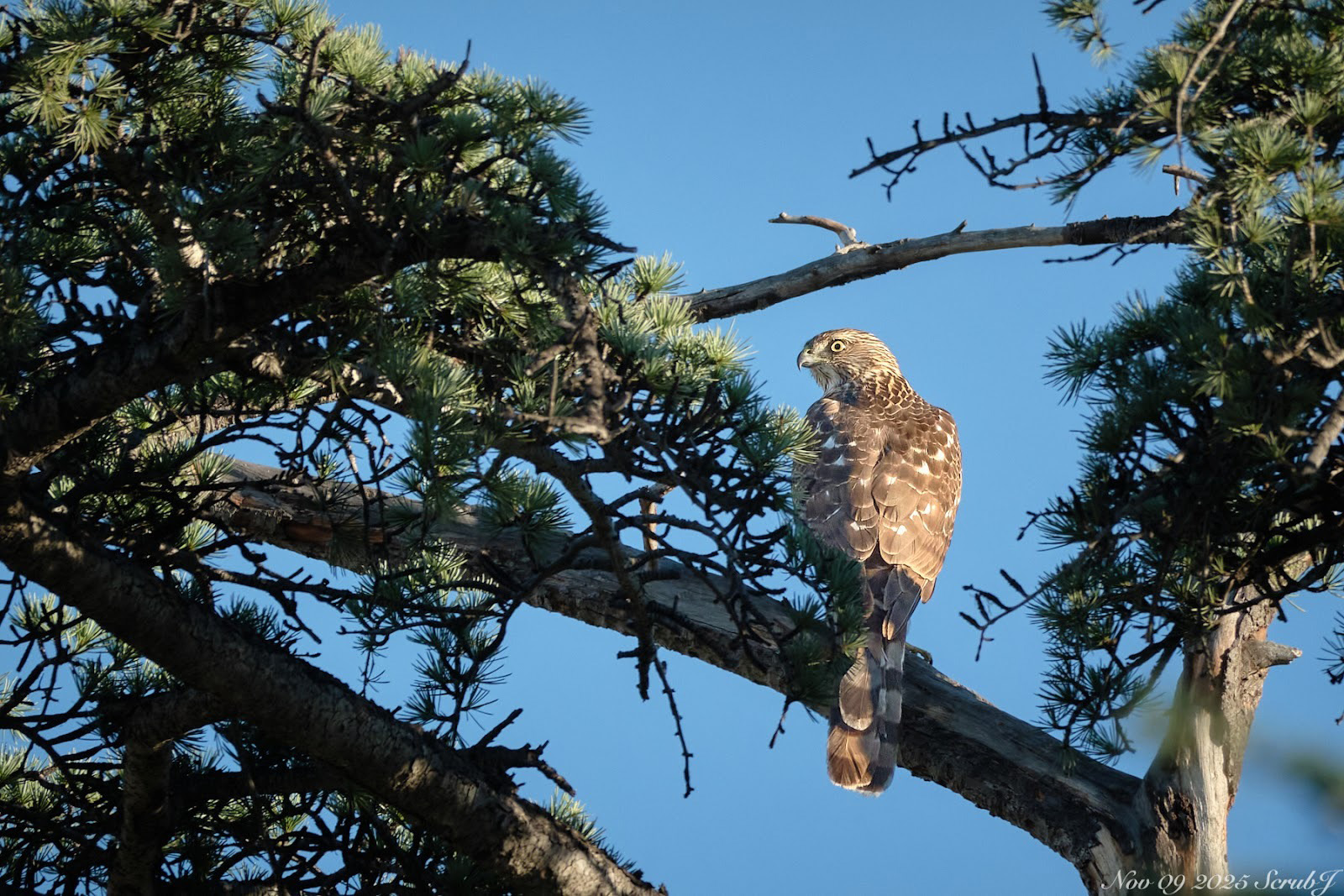 A juvenile Cooper’s hawk perched on the pine. (Credit: Jieyu Zheng)