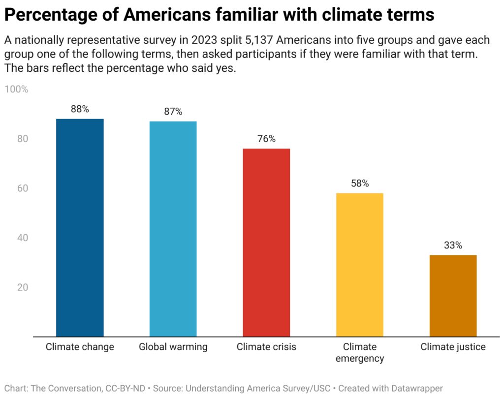 In a national survey of over 5,000 Americans, people were most familiar with “climate change” and “global warming.” “Climate crisis” and “climate emergency” were less familiar, and “climate justice” — despite being incredibly important for equity reasons — was the least familiar term of all.